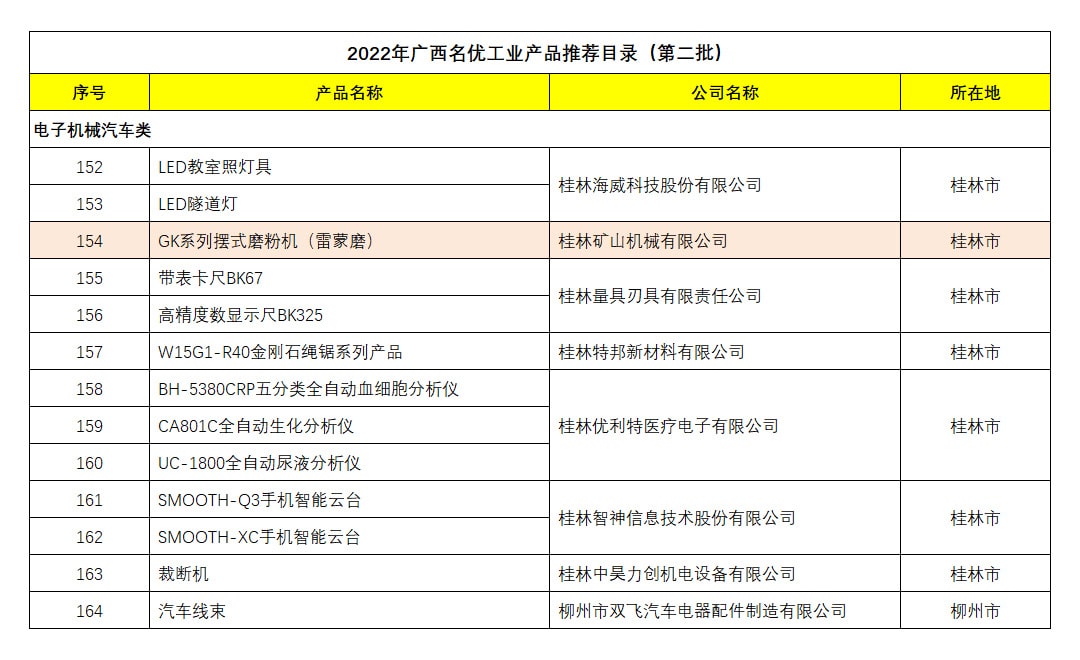 日前,通過自治區(qū)工業(yè)和信息化廳發(fā)布關(guān)于廣西名優(yōu)工業(yè)產(chǎn)品推薦目錄(第二批)的公示,桂林礦山機械有限公司擺式磨粉機產(chǎn)品成功入選《廣西名優(yōu)工業(yè)產(chǎn)品推薦目錄》(第二批)。