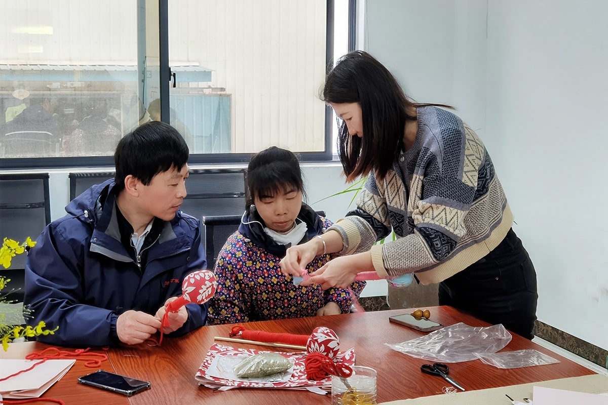 活動(dòng)伊始,主持人介紹了養(yǎng)生錘的歷史與文化背景,讓女同事們對養(yǎng)生錘有了更深刻的認(rèn)識(shí),并通過視頻方式讓大家了解養(yǎng)生錘的制作方法和注意事項(xiàng)。女同事們展現(xiàn)出了前所未有的專注和熱情,從選材、包扎、繞繩……,仔細(xì)打磨每一個(gè)細(xì)節(jié),仿佛在用自己的雙手編制著生活的印記。